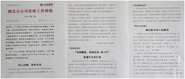 《简报》由党建园地、机构传真、欢迎新同志、党史小故事等板块组成,多窗口、多角度展现了分公司党建工作和经营工作动态,充分发挥了党建引领经营助推攻坚创效。《简报》在进一步推进党建工作与经营发展深度融合的同时,充分发挥基层党组织的战斗堡垒作用和广大党员的先锋模范作用,并为分公司发展提供坚强的政治保证、组织保证和精神动力。