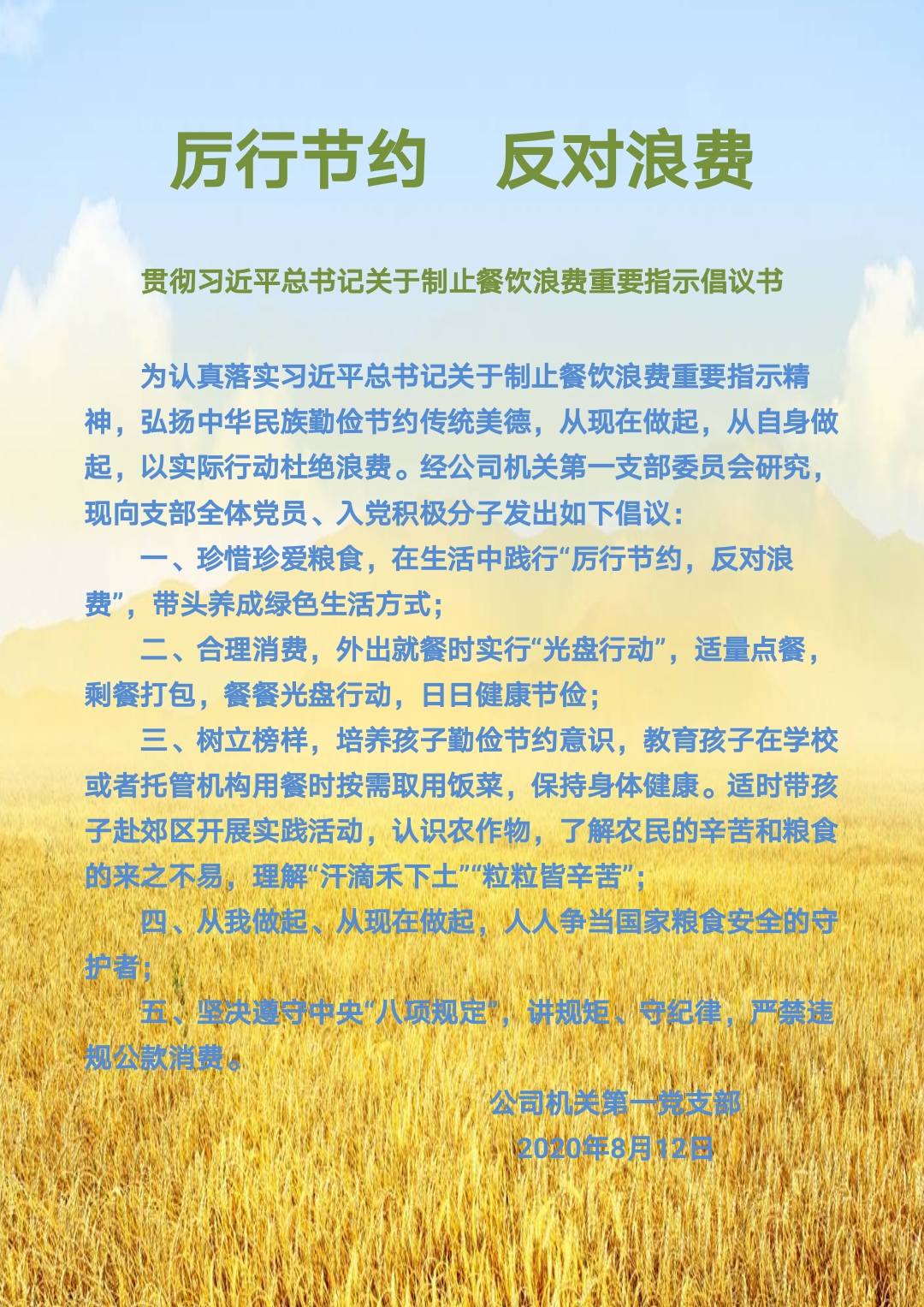 2020年8月12日,机关党委第一党支部委员会集体学习了习近平总书记“坚决制止餐饮浪费行为切实培养节约习惯在全社会营造浪费可耻节约为荣的氛围”重要指示精神。经过个人对照检查和集体讨论研究,决定向支部全体共产党员和入党积极分子发送《新闻联播》相关报道短视频,发出“厉行节约 反对浪费”倡议书。 倡议珍惜珍爱粮食,在生活中践行“厉行节约,反对浪费”,带头养成绿色生活方式。 倡议合理消费,外出就餐时实行“光盘行动”,适量点餐,剩餐打包,餐餐光盘行动,日日健康节俭。 倡议树立榜样,培养孩子勤俭节约意识,教育孩子在学校或者托管机构用餐时按需取用饭菜,保持身体健康。适时带孩子赴郊区开展实践活动,认识农作物,了解农民的辛苦和粮食的来之不易,理解“汗滴禾下土、粒粒皆辛苦”。 倡议从我做起、从现在做起,人人争当国家粮食安全的守护者。 倡议坚决遵守中央“八项规定”,讲规矩、守纪律,严禁违规公款消费。
