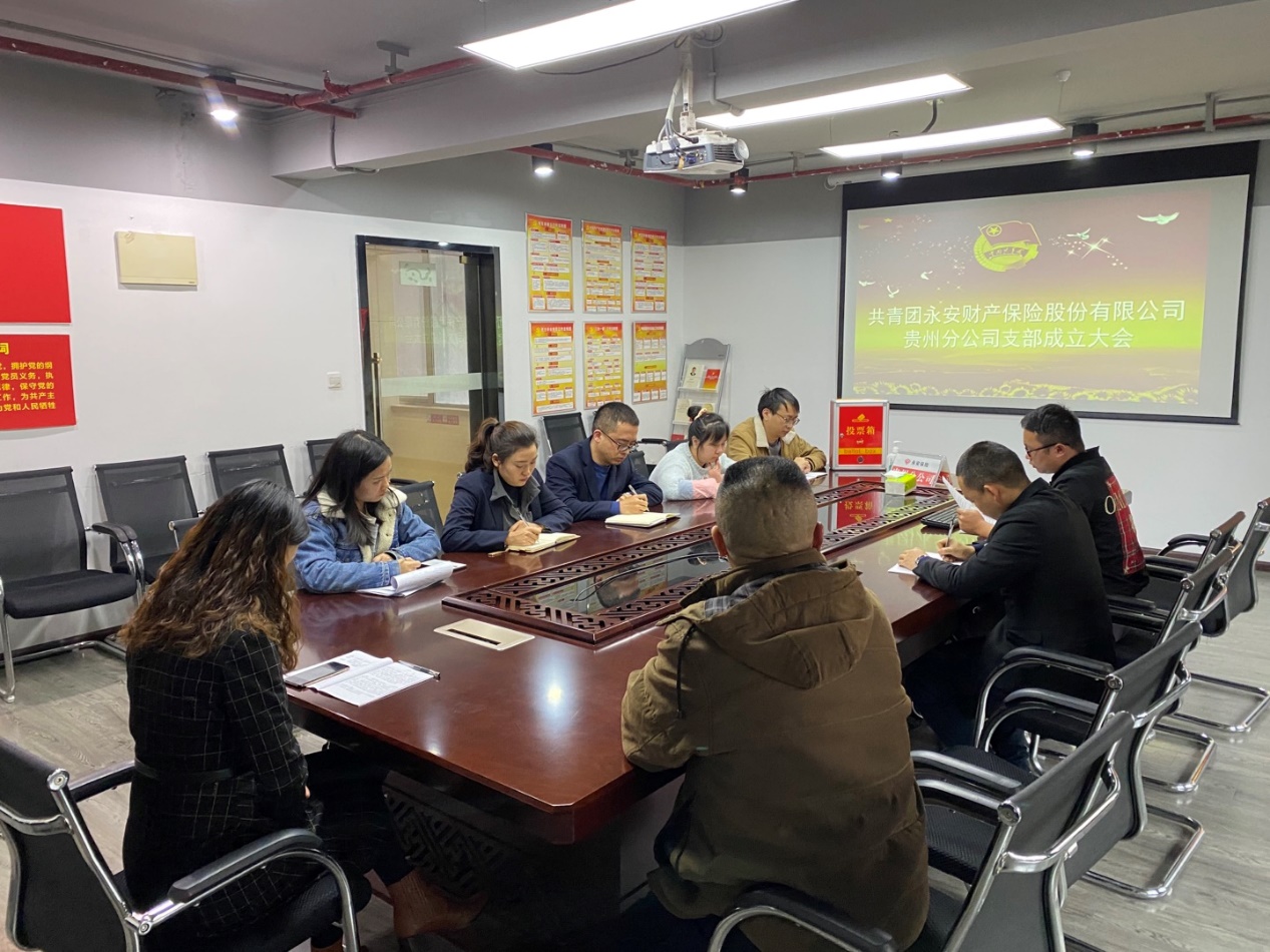 根据公司团委相关要求,贵州分公司于11月26日召开共青团永安财产保险股份有限公司贵州分公司支部成立大会。贵州分公司党支部书记龚奕同志,党支部委员会成员出席会议,7名青年员工参加了本次会议。
